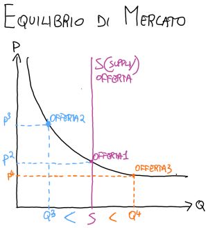 Dal lato opposto troviamo la curva di offerta. Se ipotizziamo un mercato concorrenziale e analizziamo il breve periodo, il prezzo per appartamento è identico e, dato un certo prezzo, gli appartamenti disponibili sono un numero fisso. La curva di offerta quindi ci dice quanti appartamenti vengono messi sul mercato a seconda del livello del canone.